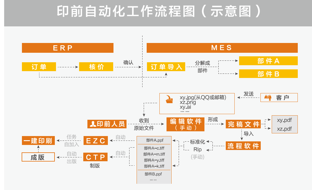 印前自動化系統(tǒng),實現(xiàn)電子文件的自動轉(zhuǎn)檔、自動預(yù)檢、自動拼版、自動生成刀模文件以及數(shù)碼印刷所需的8BIT-TIFF,文件自動流轉(zhuǎn)至印刷機(jī)。...
